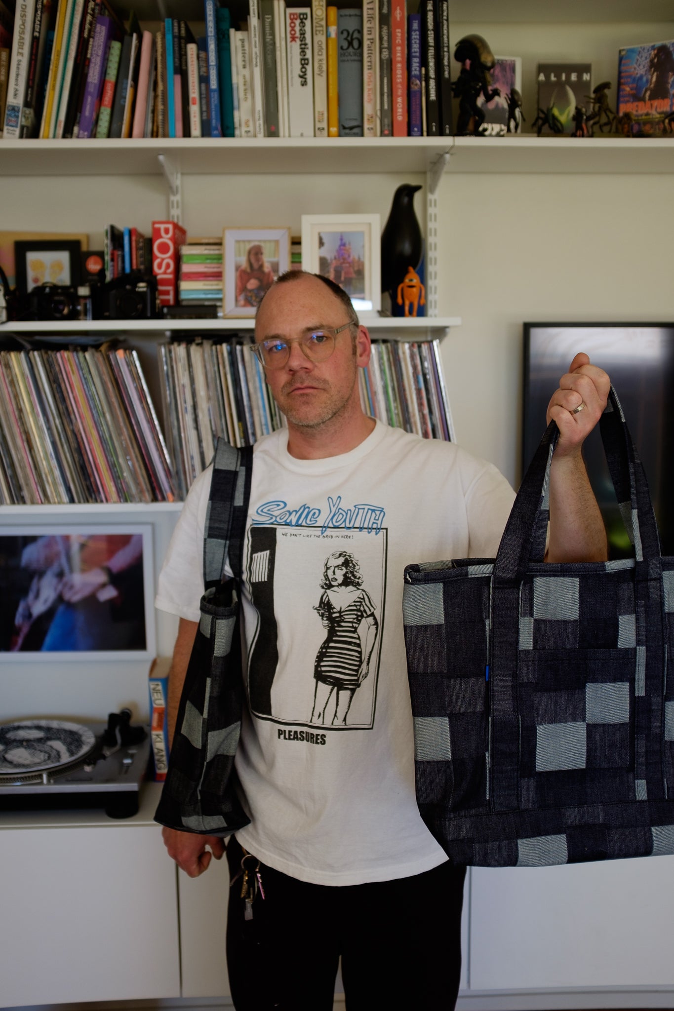 Description: Denim tote bag made from an amazing patchwork style indigo denim from Japan. The main pocket is lined with heavy drill cotton and fits a laptop or a bunch of books, or quite a bit of food. There is an inner pocket for glasses and phone, and two outer pockets for everything else. It will look even better after years of daily use.